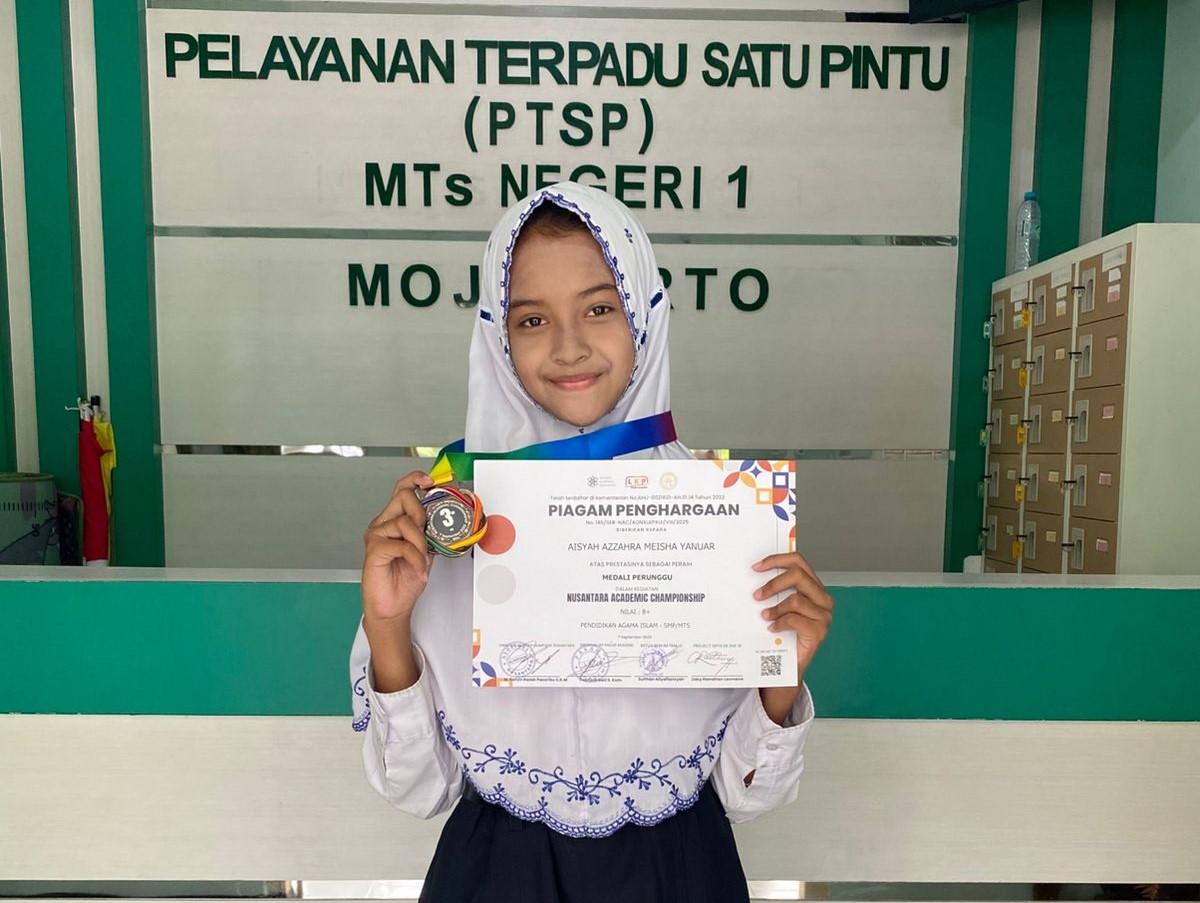 Read MoreKab. Mojokerto (MTsN 1) – Rabu, (1/10/2025) Aisyah Azzahra Meisha Yanuar, salah satu peserta didik berprestasi dari MTsN 1 Mojokerto, berhasil menorehkan prestasi gemilang dengan meraih medali perunggu di ajang Nusantara Academic Championship. Kompetisi bergengsi ini diselenggarakan oleh Asosiasi Olimpiade Nusantara pada (7/9). Dalam kejuaraan tersebut Aisyah, sapaan akrabnya, berhasil membuktikan kemampuannya di bidang Pendidikan Agama…