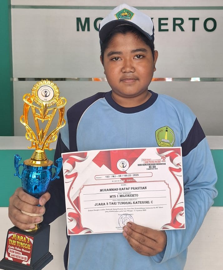 Kab. Mojokerto (MTsN 1) – Rabu, (8/10/2025) keluarga besar MTsN 1 Mojokerto kembali berbangga. Salah satu peserta didik berbakat, Muhammad Rafaf Prastian, sukses mengharumkan nama madrasah dengan meraih Juara 3 Tari Tunggal Kategori C dalam Lomba Nasional Mahir Prestasi dan Seni Hari Kemerdekaan Indonesia ke-80 Tahun yang diselenggarakan pada (17/8).