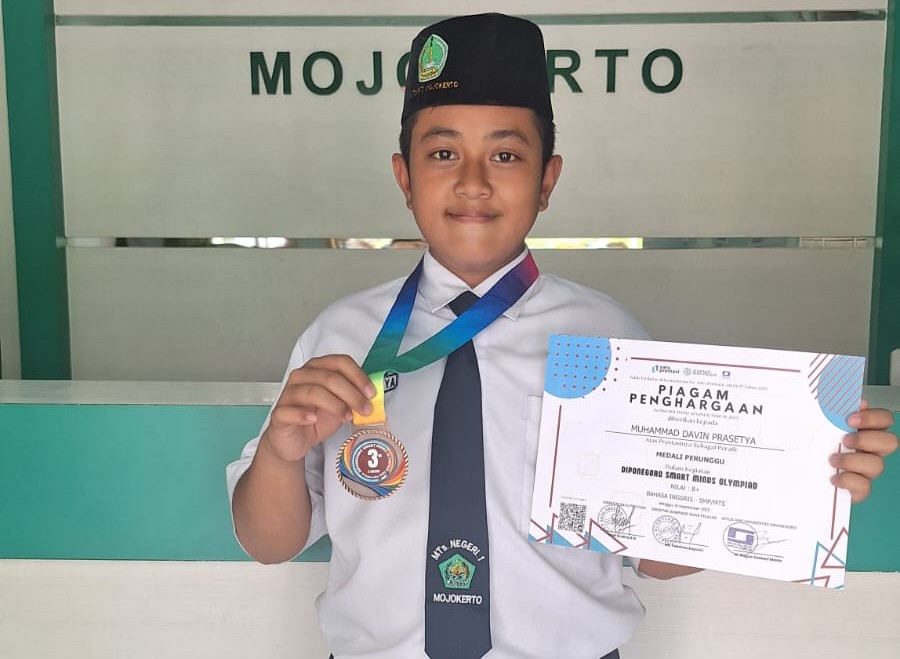 Kab. Mojokerto (MTsN 1) – Rabu, (8/10/2025) kabar membanggakan kembali datang dari MTsN 1 Mojokerto. Salah satu peserta didik dari MTsN 1 Mojokerto, Muhammad Davin Prasetya, berhasil menorehkan prestasi gemilang dengan meraih Medali Perunggu dalam ajang Diponegoro Smart Minds Olimpiad kategori Bahasa Inggris tingkat SMP/MTs yang diselenggarakan oleh Olimpiade Sains Pelajar pada (14/9).