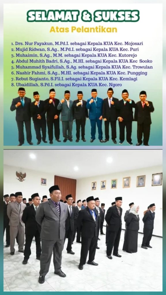 Sebanyak 78 penjabat yang dilantik tersebut mendudukijabatan sebagai Kepala Kantor Urusan Agama (KUA), Kepala Madrasah, Kepala Tata Usaha Madrasah, serta Jabatan Fungsional Penghulu. Berikut 8 orang Kepala KUA di Lingkungan Kantor Kemenag Kab. Mojokerto yang turut dilantik :