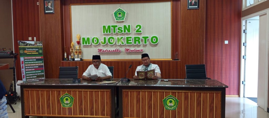 Kegiatan spiritual ini dimulai tepat pukul 07.30 WIB yang diawali sambutan kepala MTsN 2 Mojokerto Misbakhul Arifin dan Khotmil Qur’an dibuka oleh Abid Dluhawy selaku Sie Agama MTsN 2 Mojokerto.