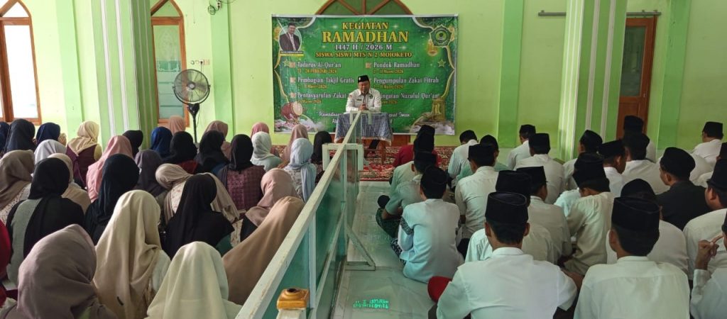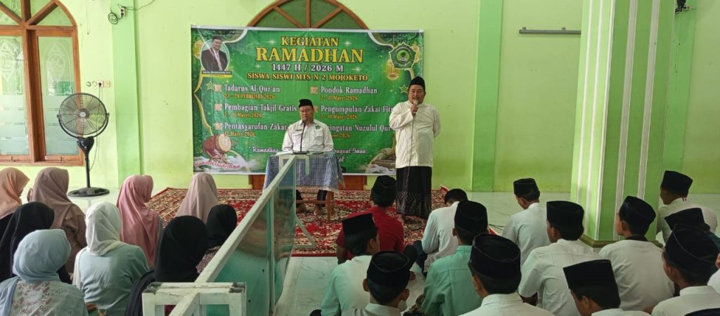 Kab. Mojokerto (MTsN 2) – Mengawali pekan pertama di bulan suci Ramadan, MTsN 2 Mojokerto menggelar kegiatan Pondok Ramadan sebagai upaya penguatan karakter dan spiritualitas siswa. Pondok Ramadan bertempat di Masjid Mafatihul Jinan, kegiatan ini dibuka secara oleh Kepala Madrasah Misbakhul Arifin, pada Senin (23/2026) pukul 07.30 WIB. Suasana khidmat menyelimuti masjid saat rangkaian acara dimulai dengan Tadarus Al-Qur’an.