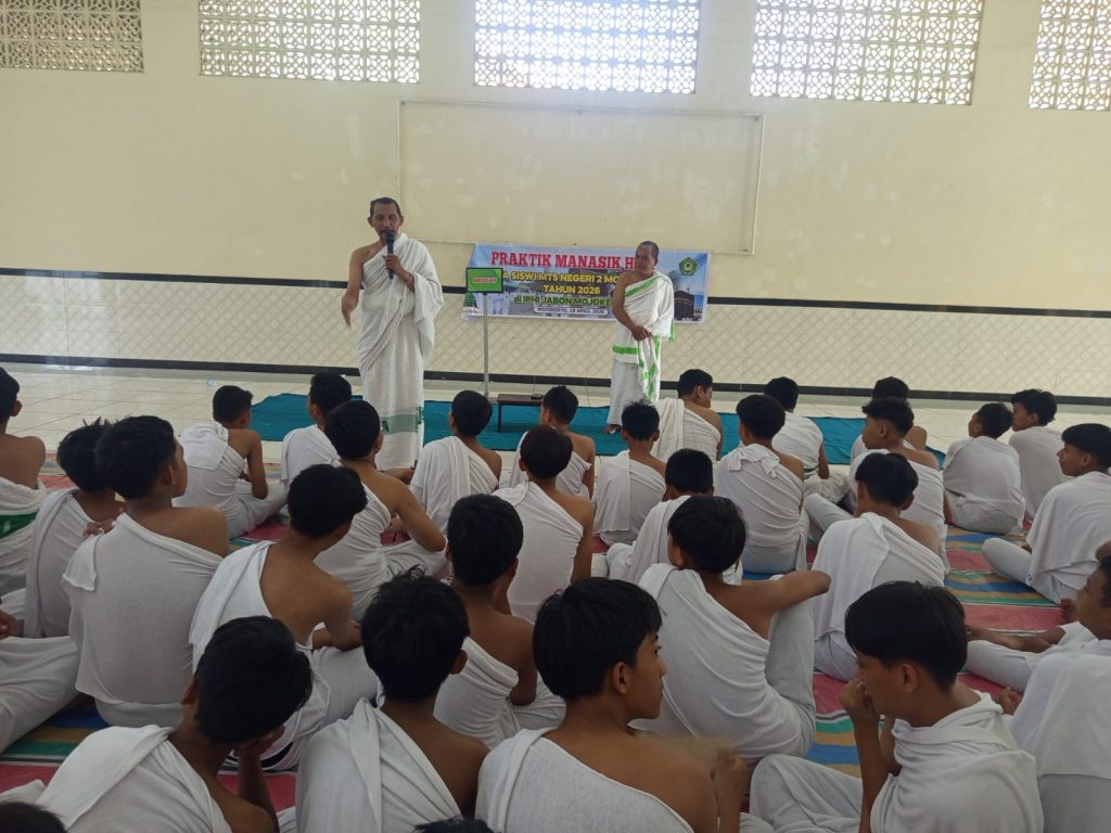 Kab. Mojokerto (MTsN 2) – Ratusan siswa MTsN 2 Mojokerto tampak memadati gedung IPHI (Ikatan persaudaraan Haji Indonesia) yang berlokasi di Jalan Raya Jabon, Kecamatan Mojoanyar, Kabupaten Mojokerto pada Sabtu, 18/4/2026. Kehadiran mereka bertujuan untuk mempraktikkan secara langsung pelajaran Fikih melalui kegiatan manasik haji dan umrah.